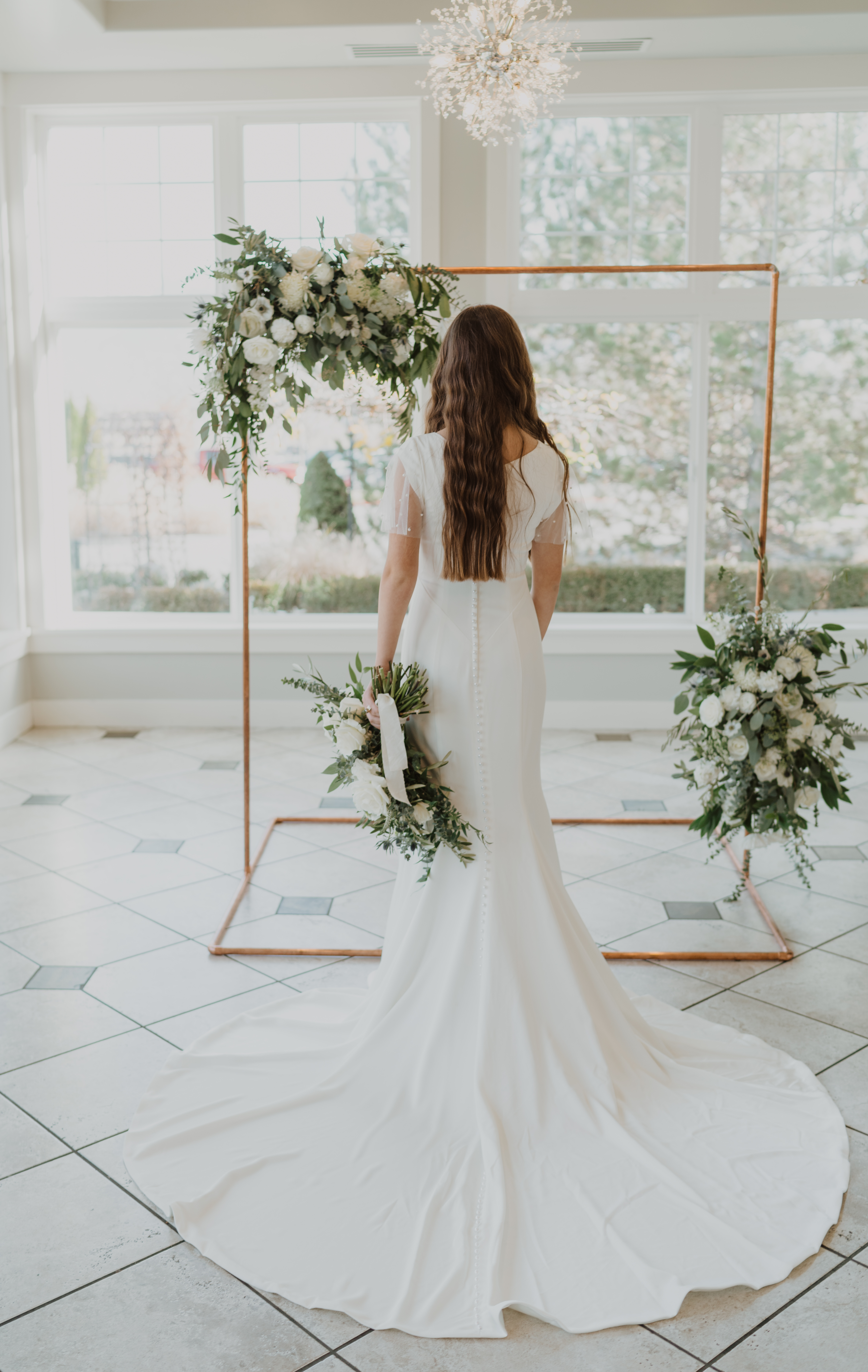 Abby is an exquisite sheath stretch satin gown that embodies sophistication. This stunning dress features a refined boat neck and elegant pearl flutter tulle sleeves, adding a touch of romantic charm. Satin-covered buttons run through the full length of the dress, offering a timeless appeal.