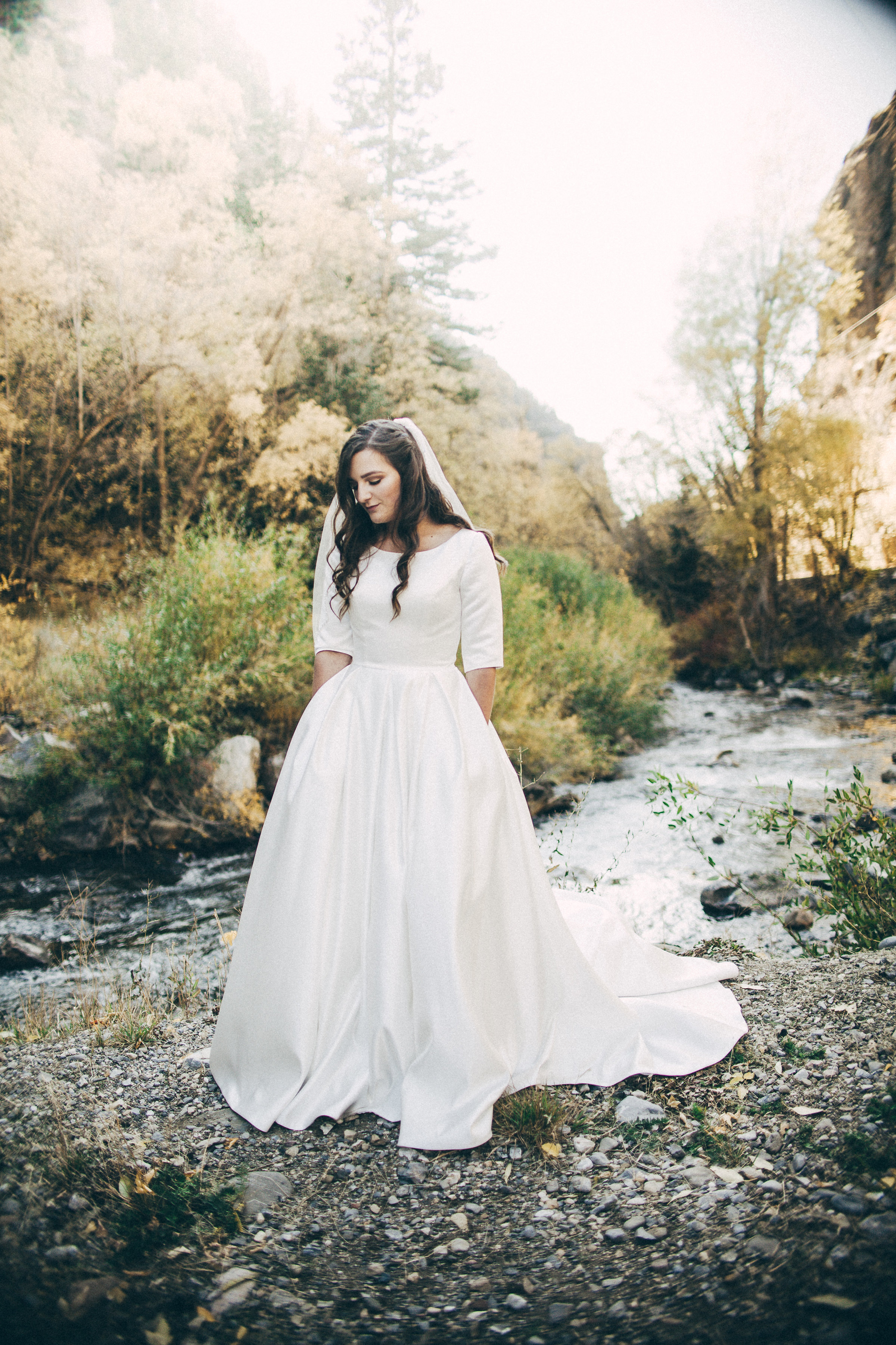 Audrey is the epitome of timeless elegance. This classic satin ballgown with pockets and a higher scoop neck is designed for the modern bride who values sophistication and convenience.