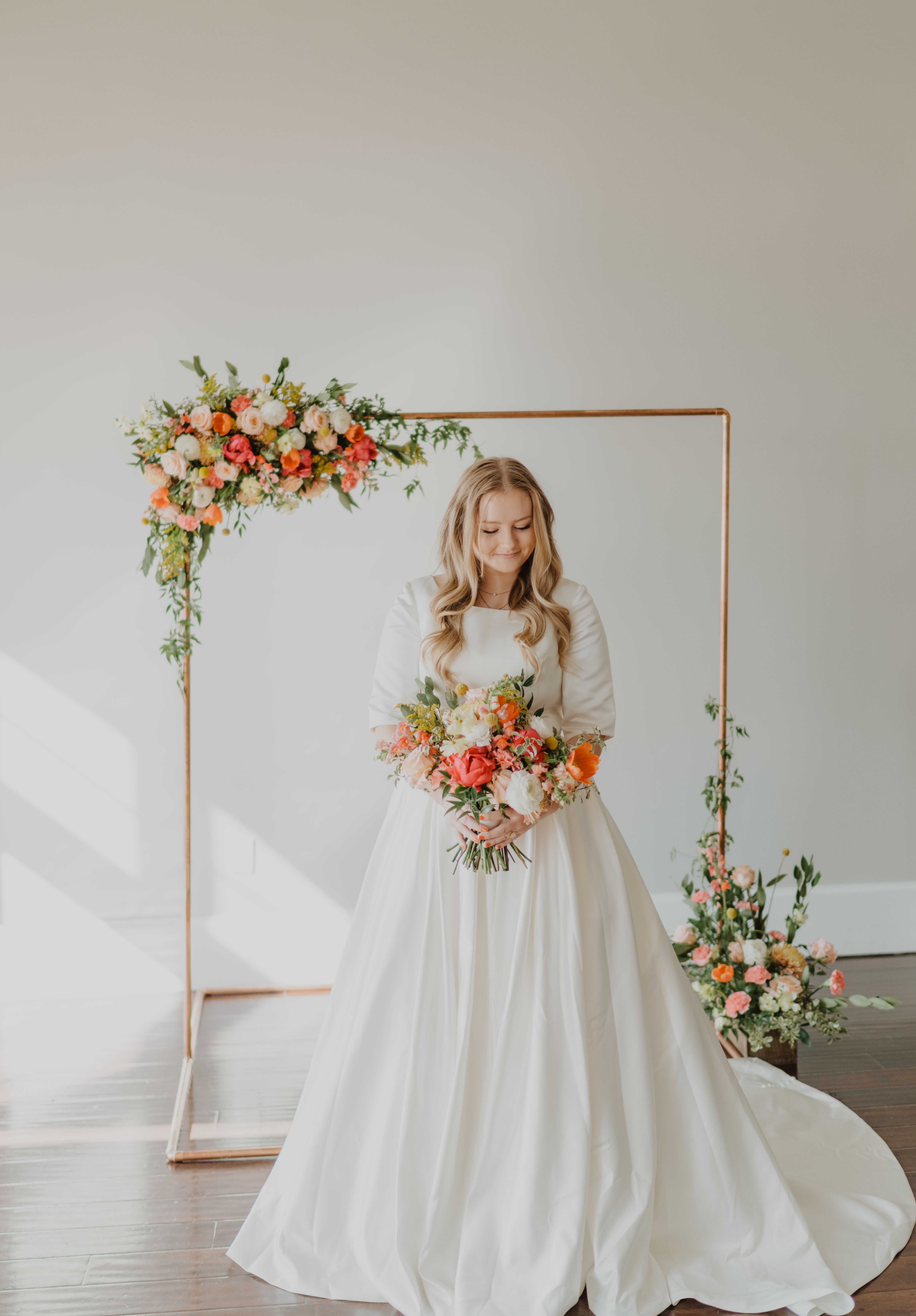 Classic satin ballgown with pockets and a higher scoop neck with buttons all the way down the back of the dress. Timeless elegance with modern details.