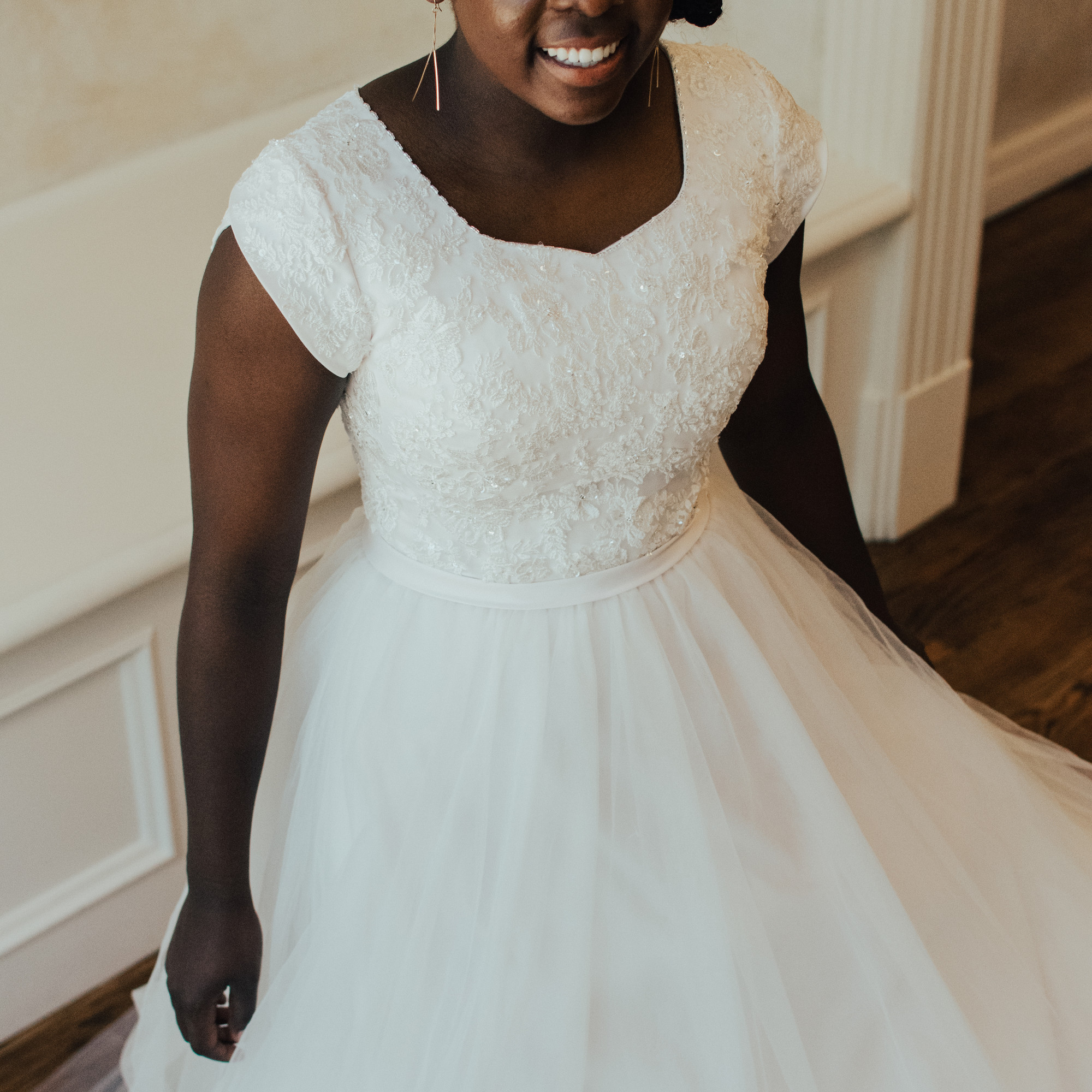 This classic ballgown has a fluffy tulle skirt and beaded bodice. A fairy-tale design that sparkles and flows beautifully.
