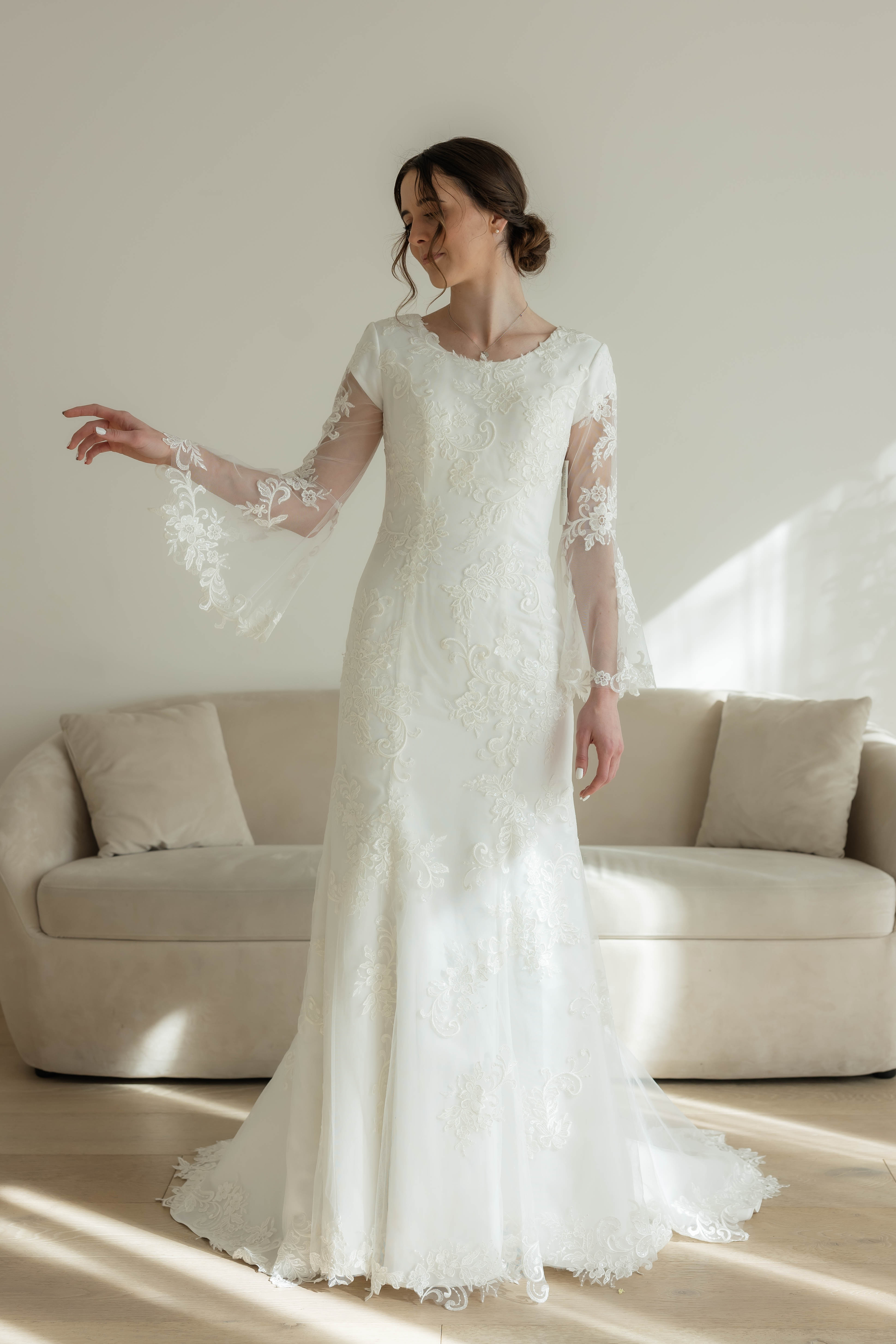 This beaded lace applique dress features bell sleeves and lace trim hem. A romantic design with vintage-inspired detailing.