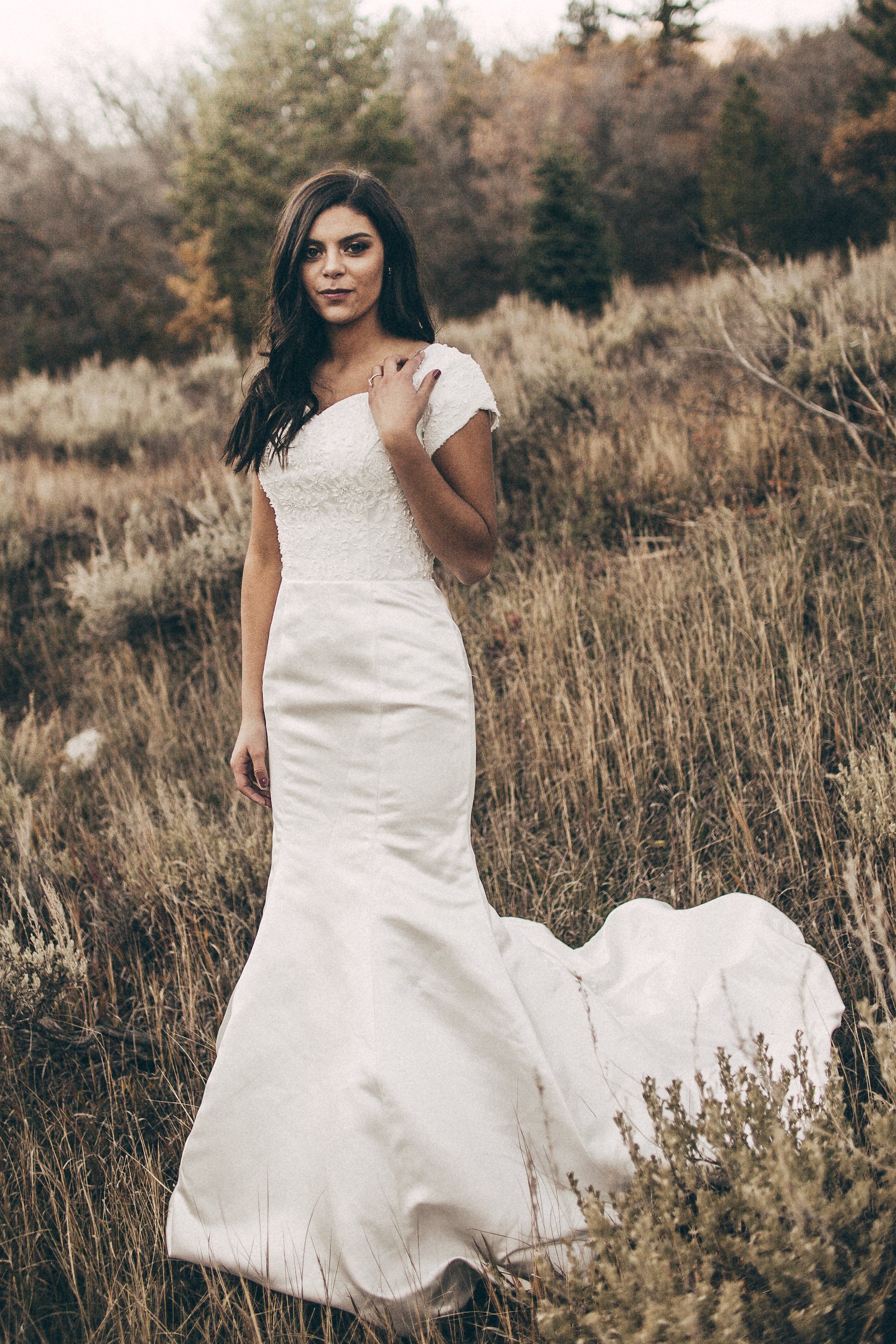 Mermaid gown with pearl buttons all the way down the back. A striking silhouette with elegant pearl button detailing.
