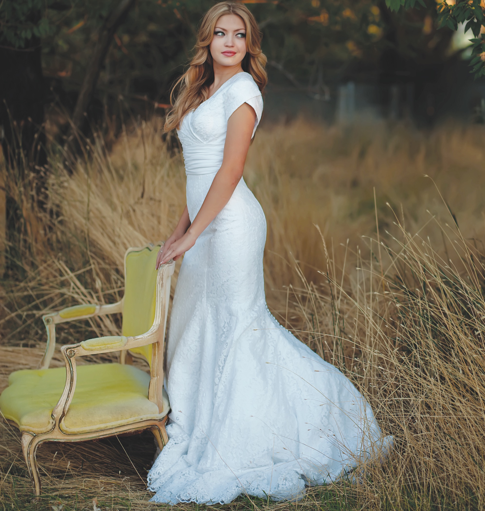 A fully lace fit and flare gown with tulip sleeves and a V-neckline. Romantic lace from head to toe.
